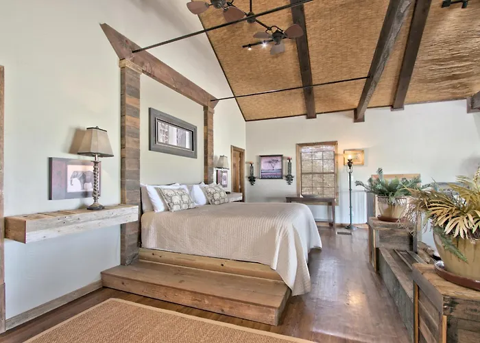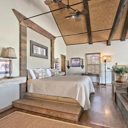 Situated amidst the serene landscapes of Texas Hill Country, the Tree House Bungalow @ Bergheim Ranch offers an idyllic escape just 50 km from San Antonio International Airport. This enchanting retreat harmoniously combines rustic charm with modern comfort, inviting guests to unwind in a tranquil atmosphere surrounded by lush greenery.